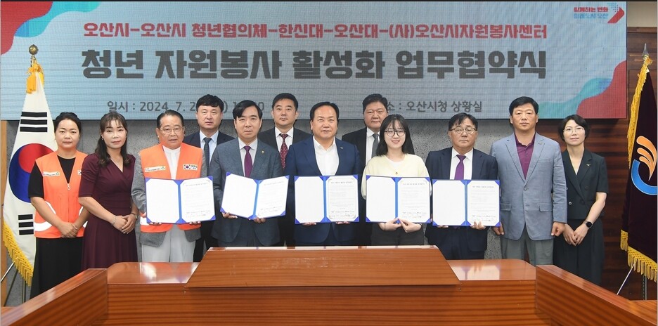 경기 오산시는 23일 시청 상황실에서 오산시 청년협의체, 한신대학교, 오산대학교, (사)오산시자원봉사센터 등 5개 기관과 '청년 자원봉사 활성화를 위한 업무협약'을 체결했다고 24일 밝혔다.