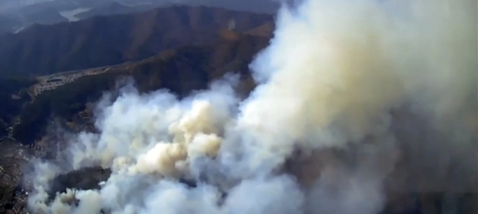 소방당국은 헬기 16대를 투입하고 소방대원 200여명 등 1200여명을 동원해 진화작업을 벌였지만, 건조한 날씨에 강한 바람까지 불어 진화에 어려움을 겪었다. 바람이 잦아들면서 확산 속도는 느려졌지만, 결국 오후 6시 50분께 해가 지면서 헬기를 동원한 진화작업은 중단됐다.