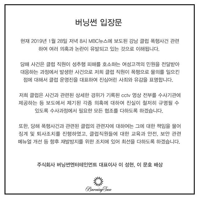 29일 버닝썬 공식 인스타그램에는 "현재 논란이 되고 있는 버닝썬 폭행사건의 입장표명입니다"라는 메시지와 함께 입장문이 담긴 이미지가 게재됐다. 공개된 이미지에는 최근 논란이 된 폭행 사건과 관련된 장문의 글이 남겨져 있다.