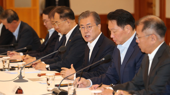 문재인 대통령과 경제계 주요인사 간담회가 10일 청와대에서 열렸다. 일본의 수출규제 대응책을 논의하는 자리였다. 삼성·현대차·SK·LG·롯데 5대 그룹을 포함해 총자산 10조 원 이상인 국내 대기업 30개사 총수 및 CEO들이 참석했다.