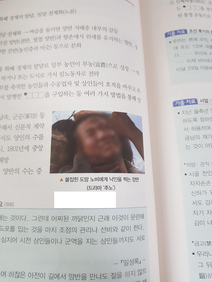 해당 교재에는 2010년 방영된 KBS 드라마 '추노'의 한 장면에 노 전 대통령의 얼굴을 합성한 이미지가 "붙잡힌 도망 노비에게 낙인을 찍힌 장면"이라는 설명과 함께 실려 있다.