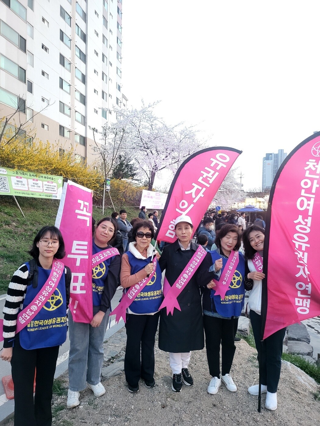천안지부 이영미 회장을 비롯한 10여명의 회원들은 원성천변의 만개한 벚꽃길을 따라 산책나온 시민들을 대상으로 사전투표와 본 투표일을 안내하고 투표 참여 약속 캠페인을 벌였다.