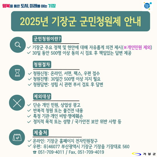 부산 기장군은 '군민청원제' 활성화를 위해 올해부터 청원 동의자 수를 기존 1000명에서 500명으로 대폭 완화해 시행한다고 10일 밝혔다.