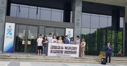 ▲ 지난해 7월 27일 서울대학교 관악캠퍼스 행정관 앞에서 학생들이 '갑질' 의혹이 제기된 한모 교수를 파면하라고 촉구하고 있다. [뉴시스]