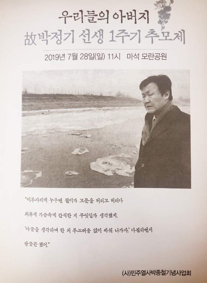 박종철 열사의 부친 박정기 선생 1주기 추모제가 28일 경기도 마석 모란공원에서 열렸다. 추모제엔 지난 24일 퇴임한 문무일 전 검찰총장도 참석했다.