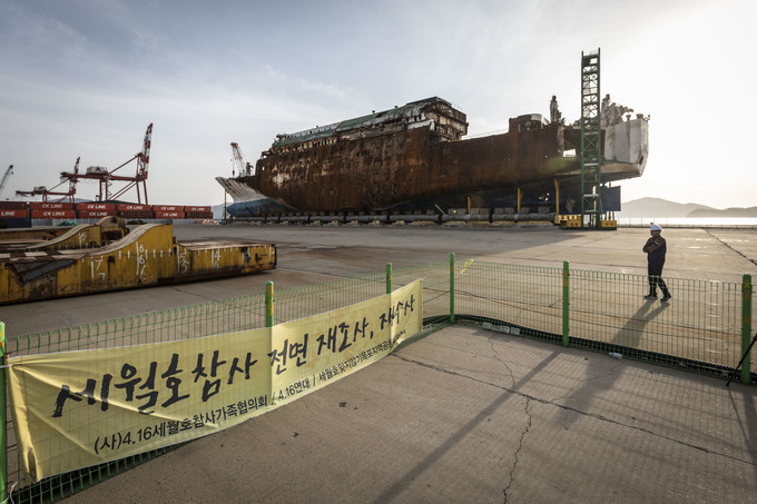 ▲ 지난 4월 15일 세월호 참사 5주기를 맞아 전남 목포시 신항에 거치된 '선체에 녹이 슨 세월호' [문재원 기자]
