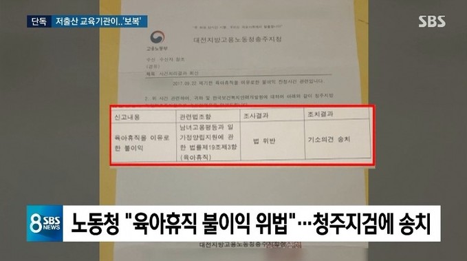 ▲ 대전지방고용노동청은 "육아휴직 불이익에 대해 위법에 해당한다"고 보고 사건을 검찰에 송치했다. [SBS 뉴스8 방송화면 캡쳐]
