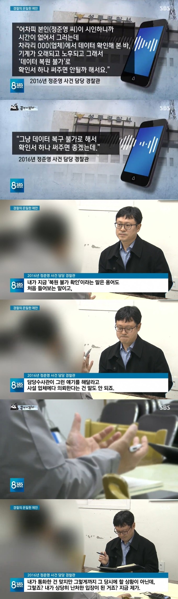 13일 취재진은 해당 통화를 했던 경찰관을 만나 복원이 불가하다는 확인서를 요구한 적이 있는지 물었다. 이에 해당 경찰관은 "지금 내가 '복원 불가 확인'이라는 말은 용어도 처음 들어보는 말이고 어떻게 담당수사관이 그런 얘기를 해달라고 사설 업체에다가 의뢰한다는 건 말도 안 되죠"고 증거 인멸 교사를 부인했다.