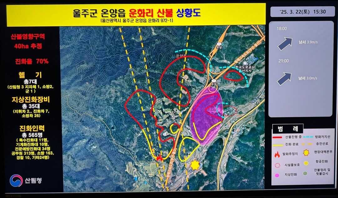 현장에는 평균 풍속 5.5m 남풍이 불고 있으며, 산불영향구역은 51.02㏊에 달한다. 오후 7시 현재 진화율은 4%이다. 오후 3시 30분 브리핑 당시 진화율이 70%에 달했으나, 화선이 크게 넓어지면서 진화율이 미미한 상태다.