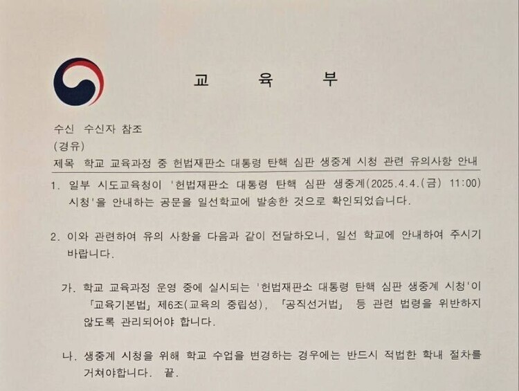 교육부는 이날 해당 교육청에 탄핵 선고 생중계와 관련해 공문을 통해 '교육기본법상 교육의 중립성, 공직선거법 등 관련 법령을 위반하는 사례가 발생하지 않도록 관리돼야 한다. 생중계 시청을 위해 학교 수업을 변경하는 경우에는 학내 절차를 거쳐야 한다'고 주문했다.