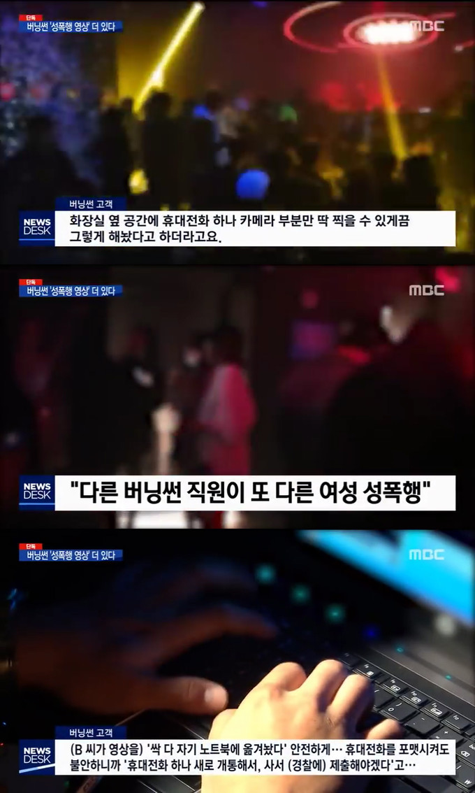 MBC는 버닝썬 직원 B 씨가 한 여성을 VIP룸 화장실로 데려와 성폭행했고, A 씨는 이를 촬영했다고 전했다.