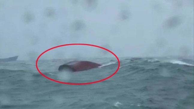 ▲ 27일 낮 12시 31분쯤 부산 두도 북동쪽 2.2㎞ 인근 해상에서 유창 청소선 A호(빨간색 원안)가 뒤집히면서 선원 2명이 실종됐다. [부산해양경찰서 제공 영상 캡처]