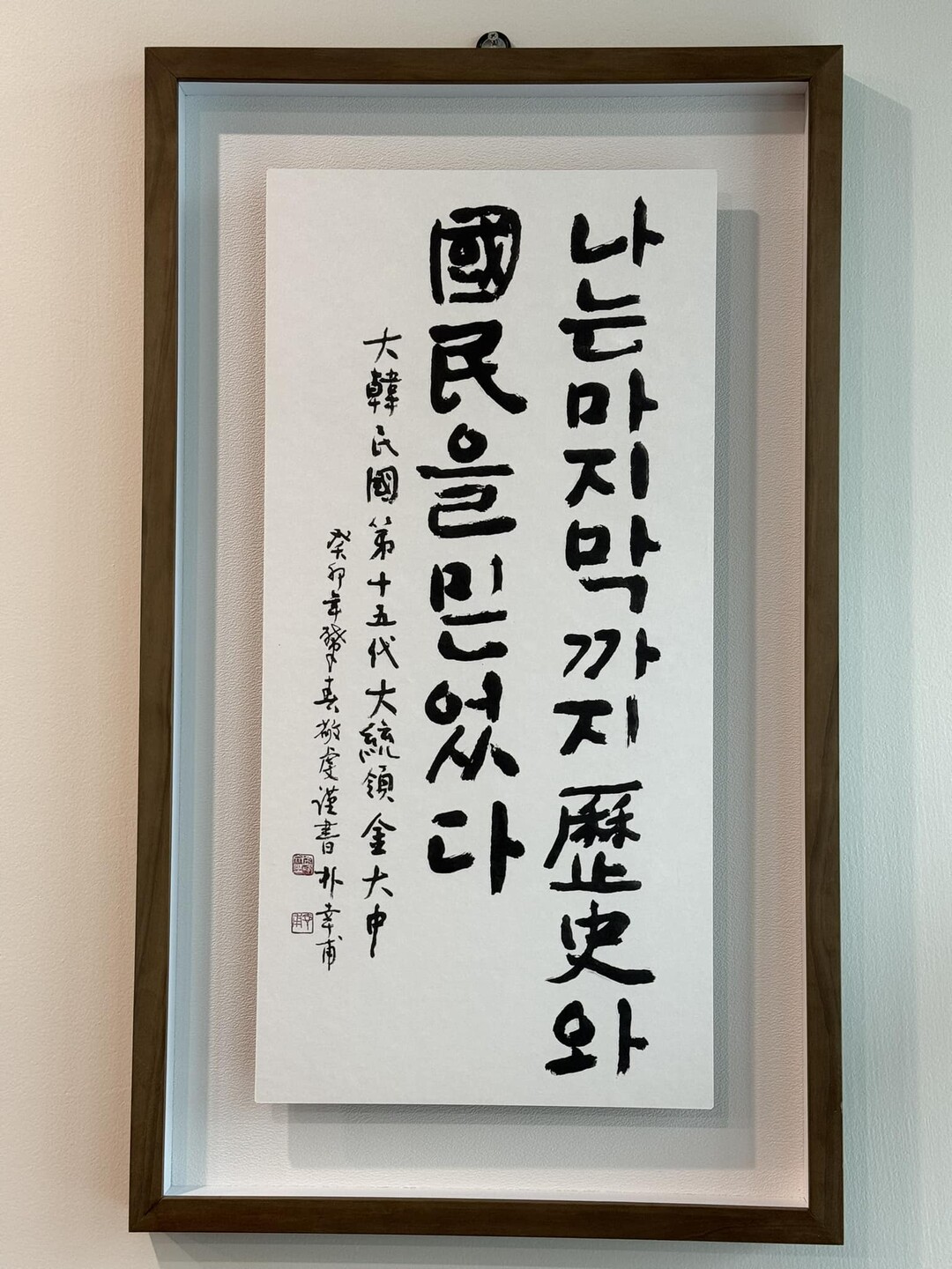 '마지막까지 역사와 국민을 믿고'는 김대중 대통령의 "나는 마지막까지 歷史와 國民을 빋었다"는 어휘에서 인용한 것이다.