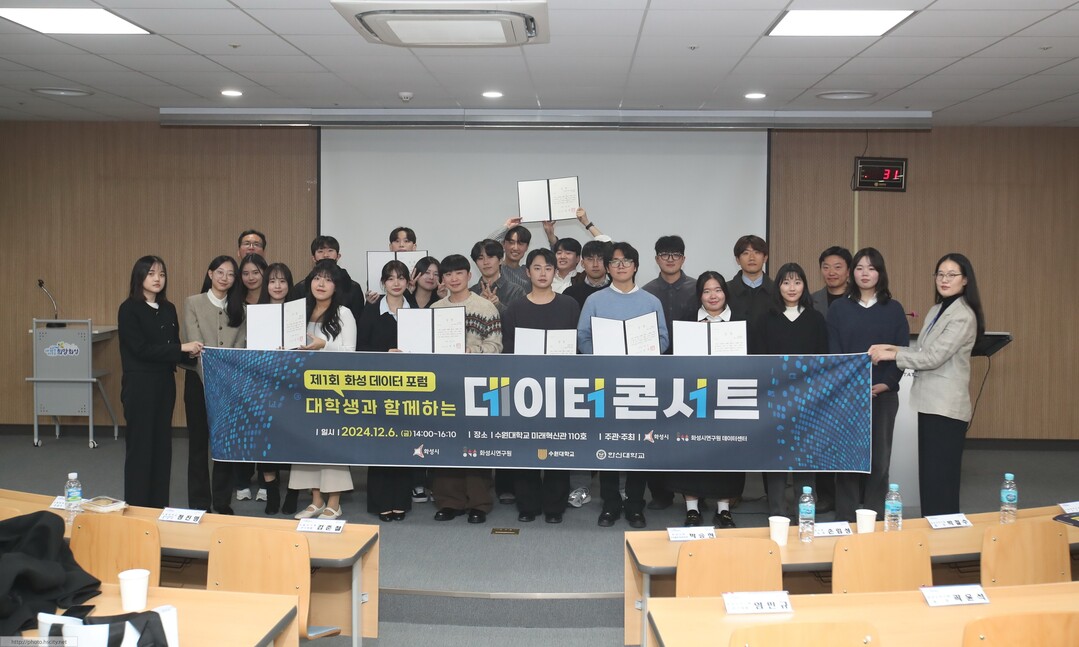 | ▲ 지난해 열린 화성시 '제1회 화성시 데이터 포럼' 수상자들이 기념촬영을 하고 있다. [화성시 제공] |