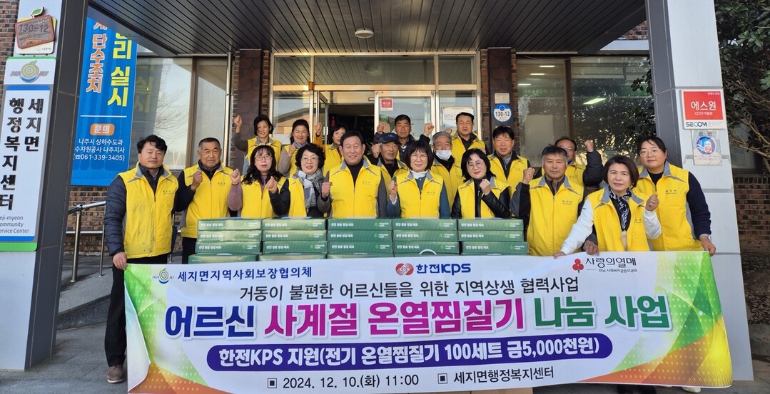 한전KPS가 2년 연속 나주 세지면 고령자를 위해 500만 원 상당의 온열찜질기를 후원했다고 13일 밝혔다.