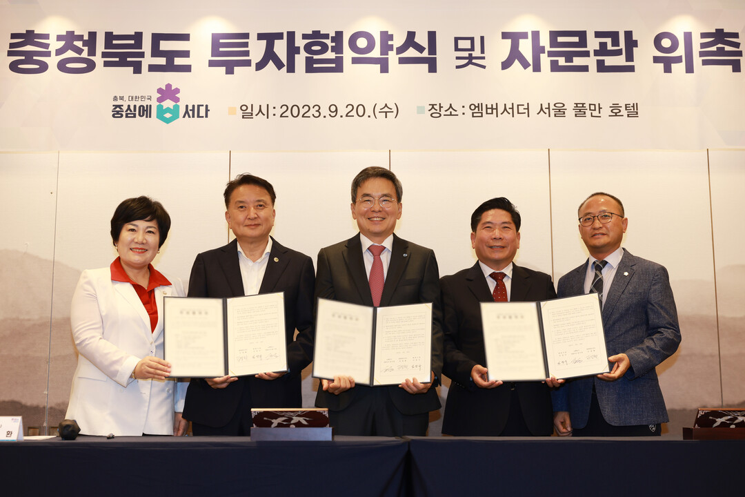충북도가 20일 앰배서더 서울 풀만호텔에서 앤에스월드, 케이씨엠인더스트리, 휴온스등 3개 기업과 3730억원의 투자협약 체결했다.