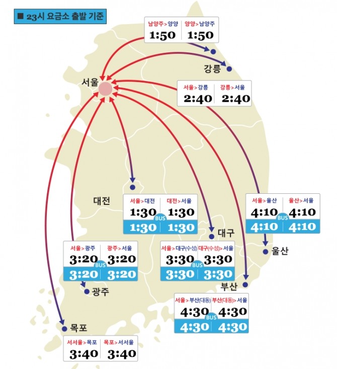 이어 △울산→서울 4시간10분 △대전→서울 1시간30분 △광주→서울 3시간20분 △남양주→양양 1시간50분이 걸릴 것으로 예상된다.