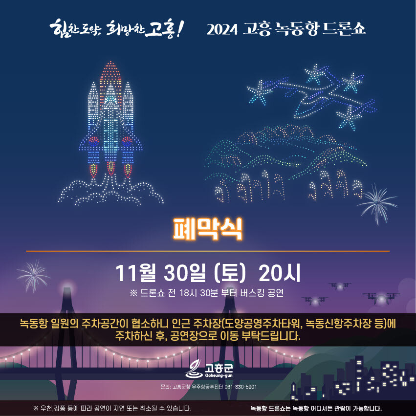 이번 드론쇼는 기상 상황에 따라 취소될 수 있으며, 자세한 사항은 고흥군 대표 누리집이나 녹동항 드론쇼 홈페이지 또는 인스타그램에서 확인할 수 있다.