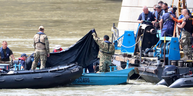 ▲ 유람선 침몰 사고 발생 일주일이 지난 4일 오후(현지시간) 헝가리 부다페스트 다뉴브강 사고현장에서 대한민국 정부 합동 신속 대응팀과 헝가리 구조대가 함께 추가 수습한 시신을 옮기고 있다. [뉴시스]