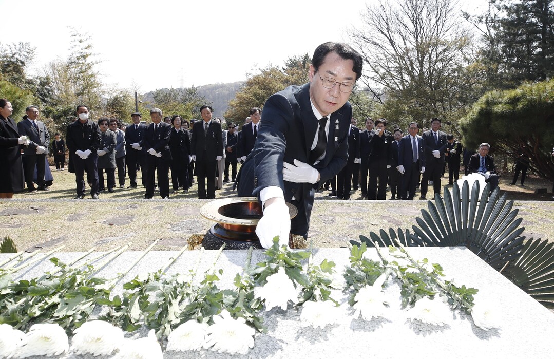 | ▲ 15일 열린 화성시 '제106주년 제암리·고주리 학살 순국선열 추모제'에서 정명근 화성시장이 제암리 순국묘역에 헌화하고 있다. [화성시 제공] |