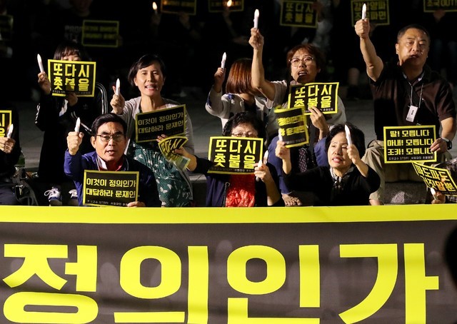 ▲ 19일 오후 서울대학교 아크로 광장에서 열린 조국 법무부장관 사퇴 촉구 집회에서 참석자들이 촛불을 들며 구호를 외치고 있다. [뉴시스]