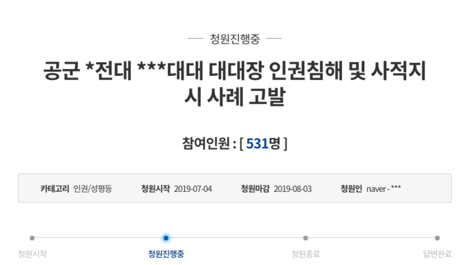 청와대 청원 글, "대대장이 '애들 성격이 쓰레기' 등 폭언 일삼아"