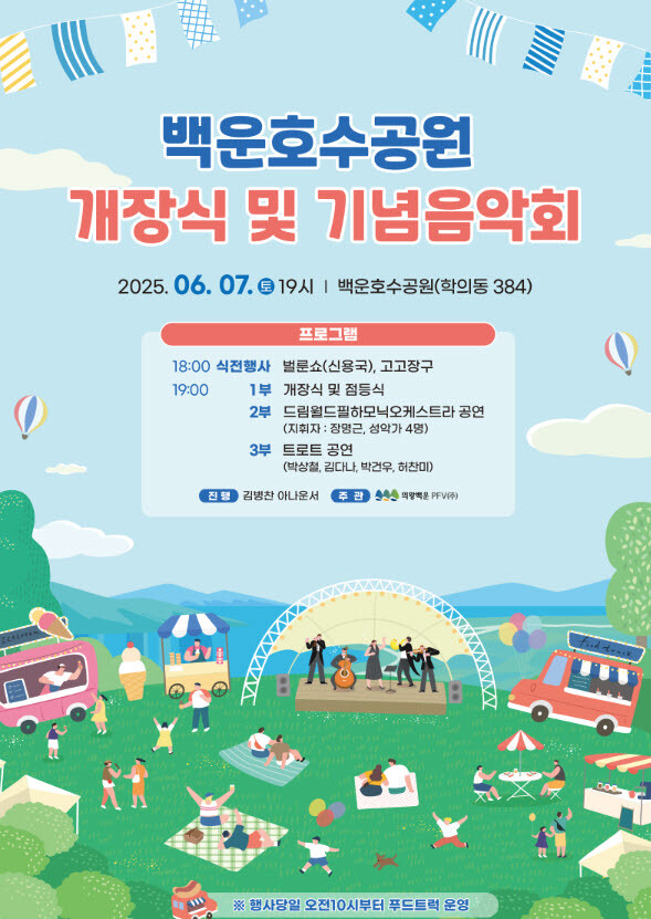 의왕백운PFV 관계자는 "이번 백운호수 공원 개장식은 단순한 공원 개장을 넘어, 공공성과 생태적 가치를 담은 공간의 복귀를 기념하는 의미 있는 행사"라며 "많은 시민 여러분들이 참석해 백운호수공원의 새로운 출발을 축하해 주시기를 바란다"고 전했다.