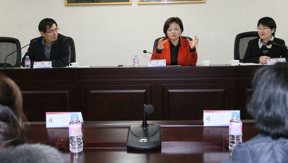 ▲ 진선미 여성가족부 장관이 1월28일 오후 경기 안성시 소재 통일부 북한이탈주민정착지원사무소 하나원에서 북한이탈 여성들을 만나 취업지원서비스 등 북한이탈여성들의 사회참여 확대방안에 대해 이야기를 나누고 있다. [여가부 제공]