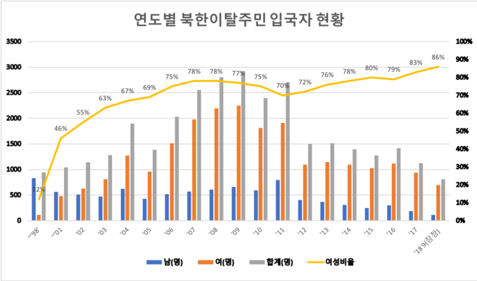 북한을 떠나 한국에 정착한 북한이탈주민 상당수가 김씨와 같은 여성이다. 통일부에 따르면 2018년 9월 기준 북한이탈주민 3만2147명 중 여성 비율은 72%에 달한다. 여성 비율은 2006년 이후 70% 이상을 유지하며 매년 증가하는 추세다. 2017년 입국자의 경우에는 83%가 여성이었다.