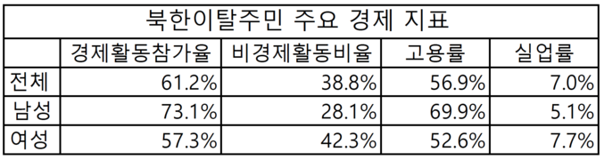 남성의 경제활동율은 73.1%인 반면 여성의 참가율은 57.3%에 그쳤다. 고용률도 남성은 69.9%였지만 여성은 52.6%에 머물렀다. 실업률의 경우에는 여성이 7.7%로 탈북 남성(5.1%)보다 높았다.