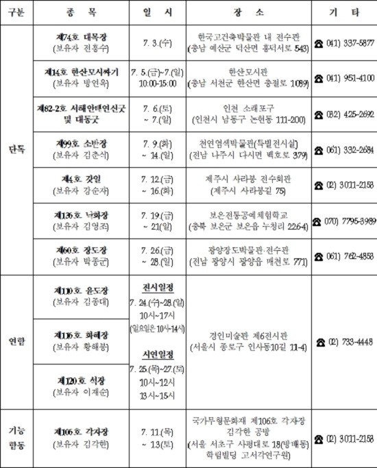 국가무형문화재의 보전과 진흥을 위해 문화재청 국립무형유산원이 지원하는 국가무형문화재 7월 공개행사가 전국 각지에서 펼쳐진다.