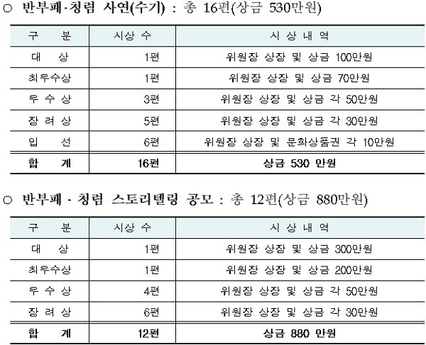 또한 우수작에 대해서는 내년 6월에 우리나라에서 개최되는 국제반부패회의 등 각종 행사에 출품할 기회가 주어진다.