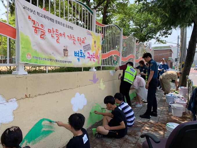 사천시청소년육성재단에서는 지난 5월 동성초등학교를 시작으로 지난 20일 용현초등학교를 끝으로 관내 9개 학교에서 “꿈을 만들어 가는 학교”라는 주제로 학교폭력예방 벽화디자인 활동을 펼쳤다.
