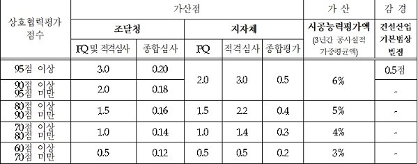 국토교통부 관계자는 “2020년부터는 협력업자와의 안전한 시공환경 조성을 위해 일체형 작업발판 사용 실적과 건설현장에서의 사망자수를 평가하는 한편, 중소업체의 기술력이 제고될 수 있도록 협력업자에 대한 기술 전수 및 성과공유제 수행 실적 등도 함께 평가에 반영할 예정으로서 현재 평가기준 개정안을 행정예고 중”이라며, “앞으로도 건설 산업의 상생 협력과 공생발전 유도를 위한 방안을 지속적으로 마련할 계획이다.”라고 밝혔다.