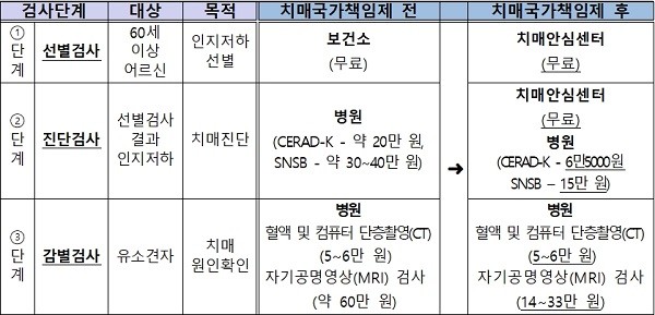 이번 제도개선은 치매국가책임제 내실화의 일환으로, 치매가 걱정되는 노인들이 치매안심센터 또는 의료기관에서 치매 진단검사를 받을 때 비용에 대한 부담이 줄어들 것으로 보인다.