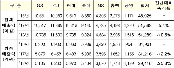 전체 매출액은 2017년 대비 0.5% 감소한 5조 1,289억원이며 방송매출액은 2017년 대비 5.8% 감소한 2조 9,416억원으로, 온라인·모바일을 통한 상품 판매가 증가함에 따라 방송매출액이 전체 매출액보다 더 큰 폭으로 감소했다.