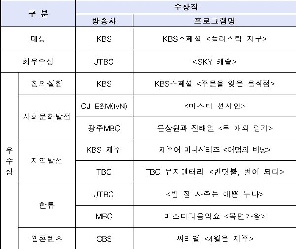 방송통신위원회는 시청자들이 2019년 방송대상 수상작을 TV, 모바일을 통해 무료로 시청할 수 있도록 오는 28일 ∼ 21일 까지 ‘방송통신위원회 방송대상 특별관’을 운영하기로 했다.