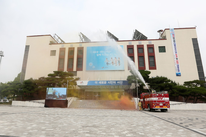 서산시는 지난 27일 시민체육관에서 ‘2019 재난대응 안전충남훈련’의 일환으로 다중이용시설 대형화재 및 붕괴사고 대응훈련을 실시했다고 밝혔다.