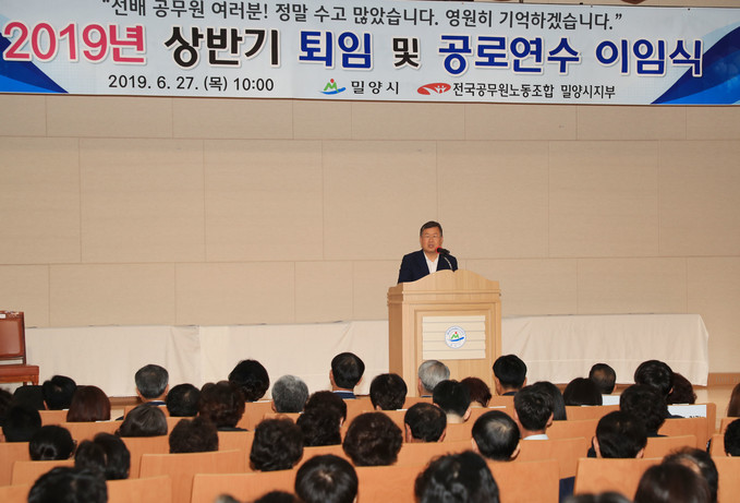 밀양시는 지난 27일 시청 대강당에서 밀양시의 발전을 위해 오랜 시간 묵묵히 힘써온 공직자들의 퇴임 및 공로연수 이임식을 개최했다.