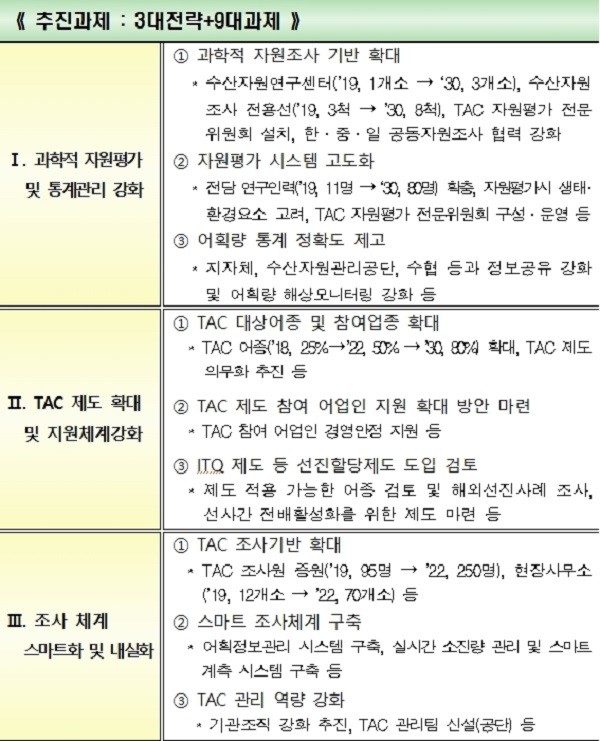 ‘TAC 제도 내실화 및 확대 계획’은 , 과학적 자원평가 및 통계관리 강화 , TAC 제도 확대 및 지원체계 강화 , TAC 조사체계 스마트화 및 내실화라는 3대 전략과 9개 과제로 구성되어 있다.