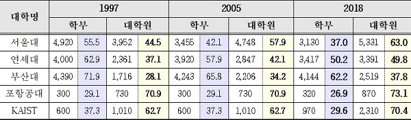 < BK21 사업 지원 대학의 학부:대학원 입학정원 현황(명, %)>