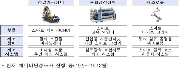 산업부는 동 사업을 주력산업인 기계장비산업을 고부가 유망품목 중심으로 전환하고, 동시에 제조업의 스마트화·친환경화·융복합화 실현을 뒷받침하기 위한 사업으로 준비 중이며, 3대 제조장비 분야에 대해 스마트제조장비와 그 핵심 부품 및 스마트 유연화자동화 시스템을 종합 개발할 계획이다.