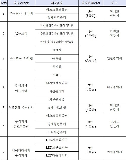특히, ㈜에이텍의 ‘데스크톱컴퓨터’, ‘일체형컴퓨터’는 종전 A등급에서 S등급으로 품질이 크게 향상되어 5년간 납품검사가 면제된다.