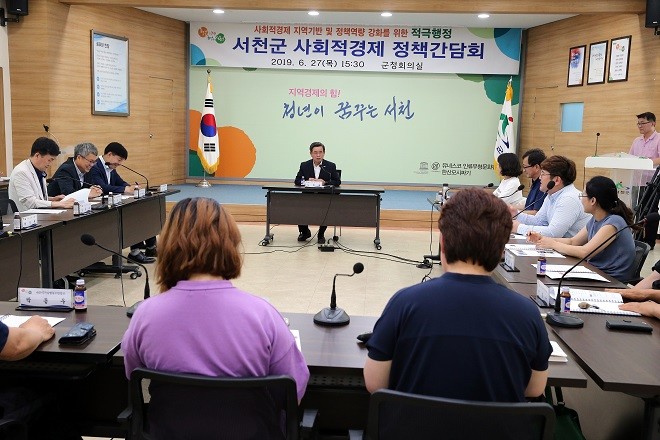서천군이 지난 27일 군청 대회의실에서 사회적경제 중간지원기관, 사회적경제 연대조직, 사회적경제기업 운영자, 상생협력기관 관계자 등 20여명이 참석한 가운데 ‘사회적경제 정책 간담회’를 개최했다.