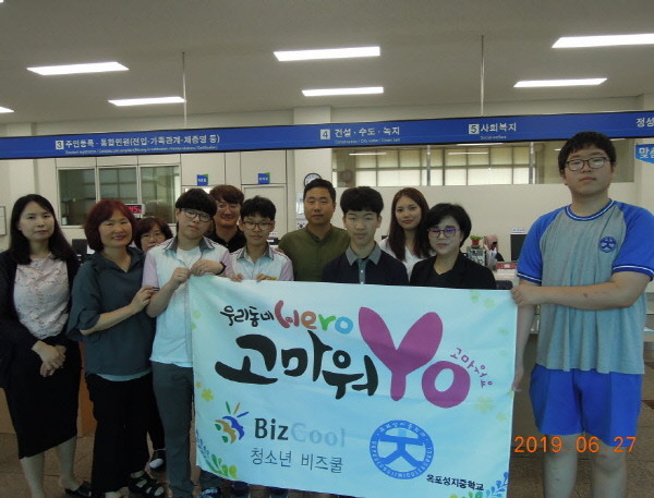 지난 27일 성지중학교 청소년 비즈쿨 동아리 회원 5명은 진로체험선생님과 함께 옥포1동 주민센터를 방문해 주민센터 시설 견학 후 동에서 이뤄지는 여러 가지 업무들에 대한 설명을 듣고 동민을 위해 애써주시는 공무원들께 감사 인사를 전했다.
