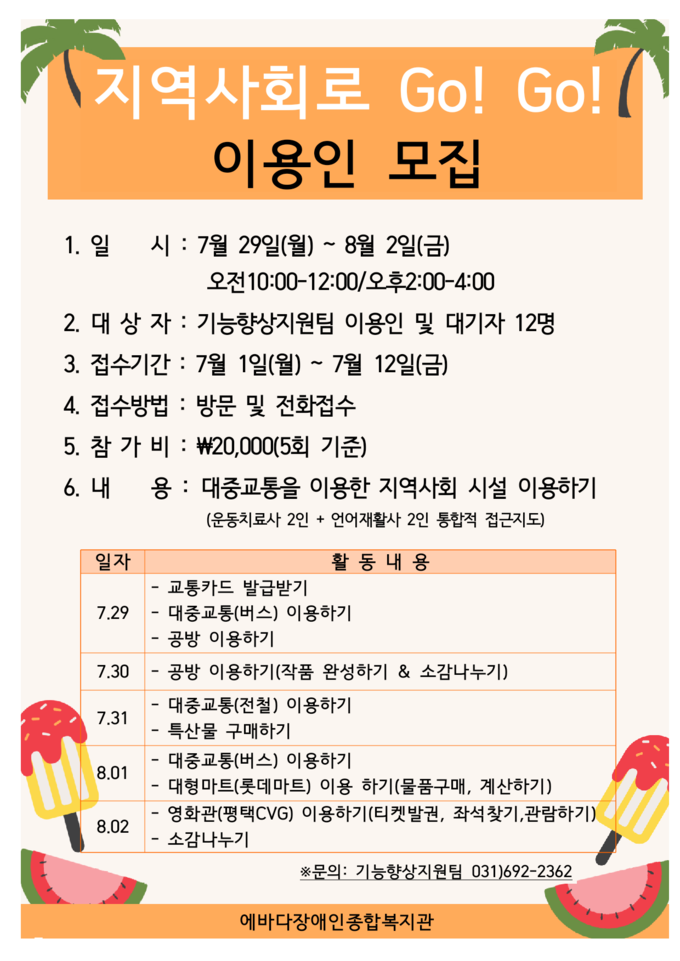 에바다장애인종합복지관에서는 오는 29일부터 8월 2일까지 총 5회기에 걸쳐 학령기 및 학령전기 아동을 대상으로‘지역사회로 GO GO’프로그램을 실시한다.
