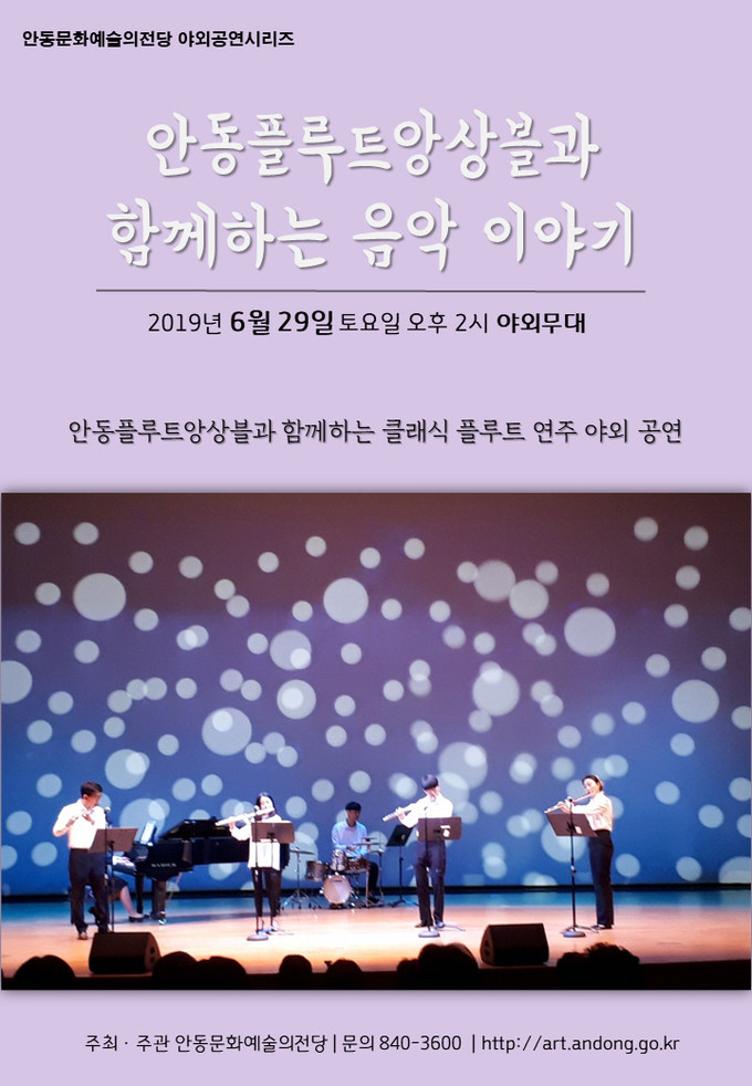 안동플루트 앙상블은 정통클래식부터 현대음악에 이르기까지 클래식, 뮤지컬, 대중가요 등 다양한 장르의 레퍼토리를 갖고 활동 중인 전문음악인으로 구성된 지역단체로 관람객들에게 감성적인 레퍼토리 및 또 하나의 즐거움과 감동을 선사할 예정이다.