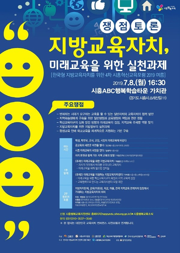 시흥시는 오는 8일 오후 4시 30분 시흥ABC행복학습타운 가치관에서 시교육지원청, 시의회, 혁신교육지방정부협의회와 공동 주최로‘지방교육자치, 미래교육을 위한 실천과제’을 개최한다.