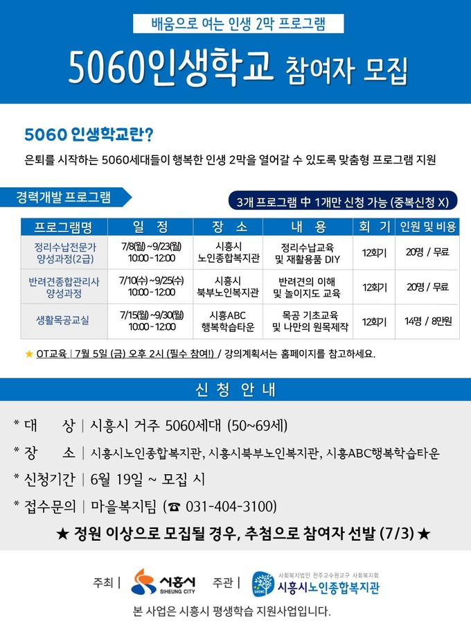 7월부터는 새로운 커리어 경로를 모색하기 위한 경력개발프로그램인 정리수납전문가 2급 양성과정, 반려견 종합관리사 양성과정, 생활목공교실 등 3가지 프로그램이 각 12주 과정으로 시흥시노인종합복지관, 북부노인복지관, 시흥ABC행복학습타운 3곳에서 각각 진행된다.