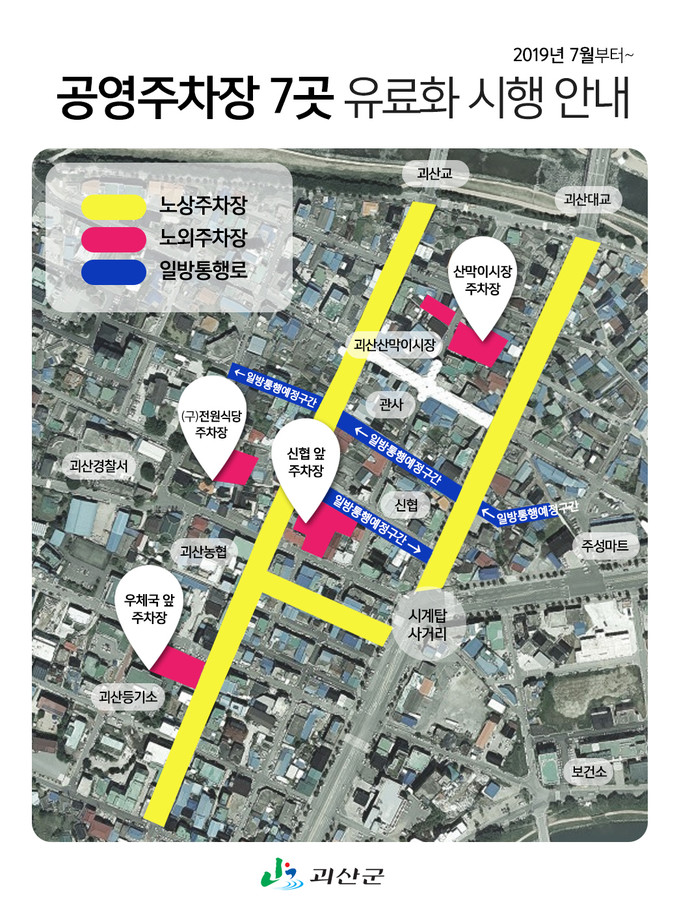 이번에 유료화된 공영주차장은 괴산교에서 D마트 괴산농협에서 시계탑사거리 괴산대교에서 시계탑사거리 등 노상주차장 3개소와 舊전원식당 주차장 괴산우체국 앞 주차장 괴산신협 앞 주차장 산막이시장 주차장 등 4개 노외주차장 등 총 7개소다.